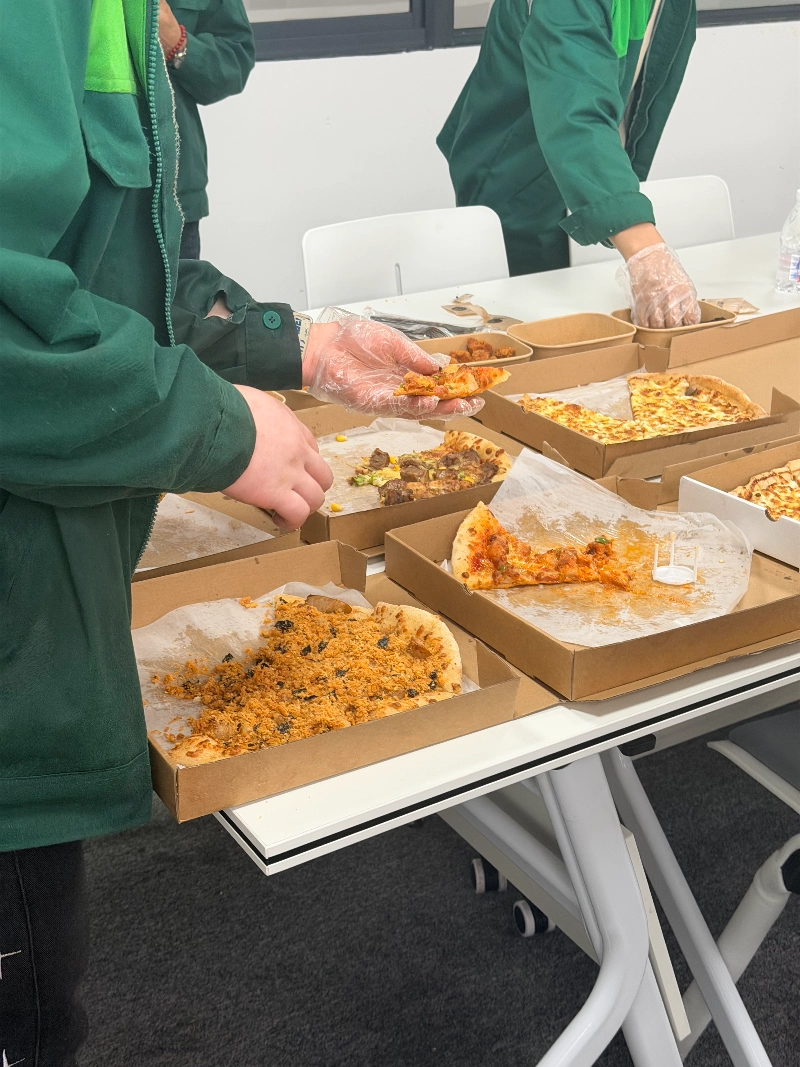 পিজা একটি টুকরা, যত্ন একটি অঙ্গভঙ্গি. একটি সাধারণ ট্রিট শান্তভাবে দলকে কাছাকাছি নিয়ে এসেছে।